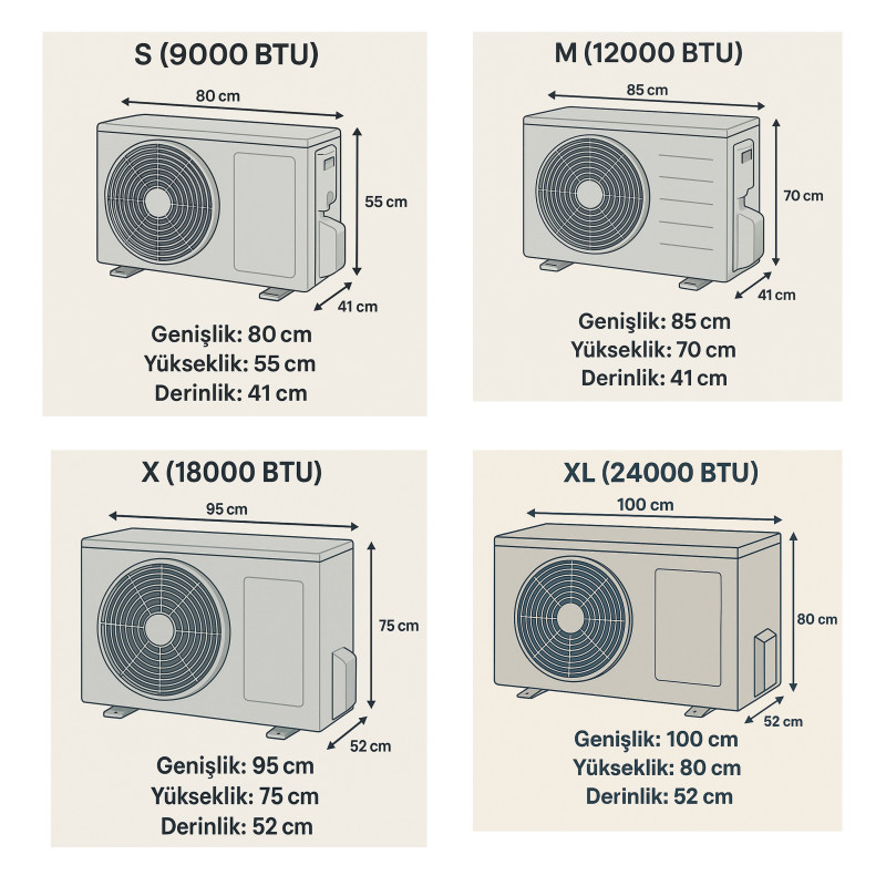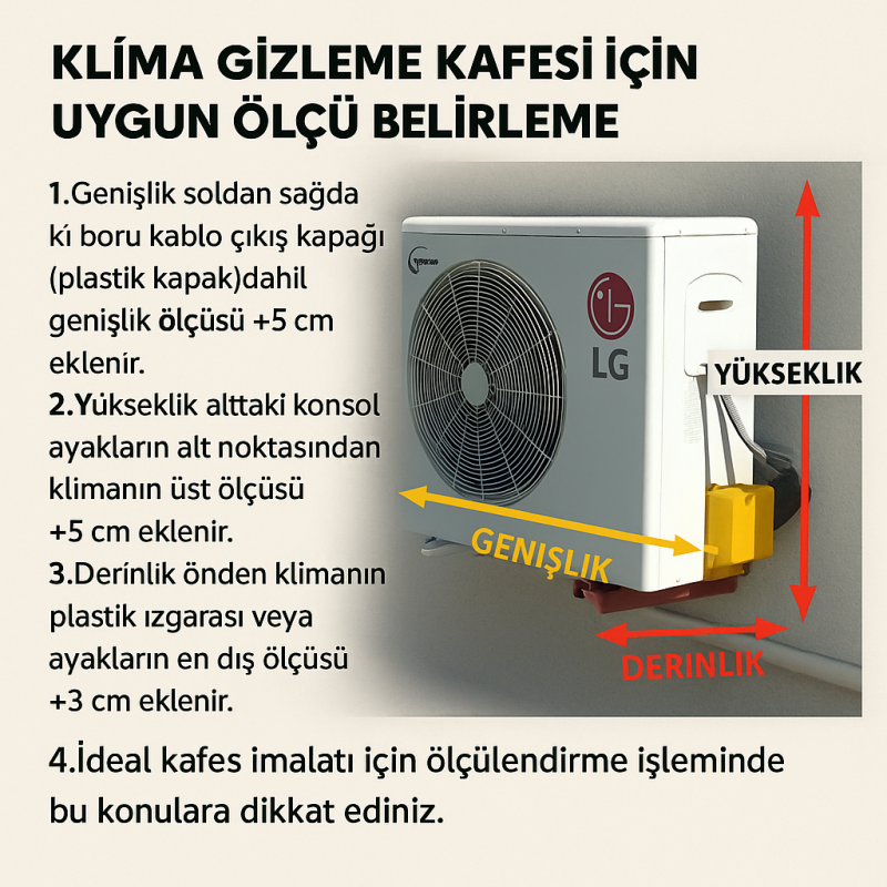 Ölçüler, standart klima dış ünite ortalamalarına göre belirlenmiştir.